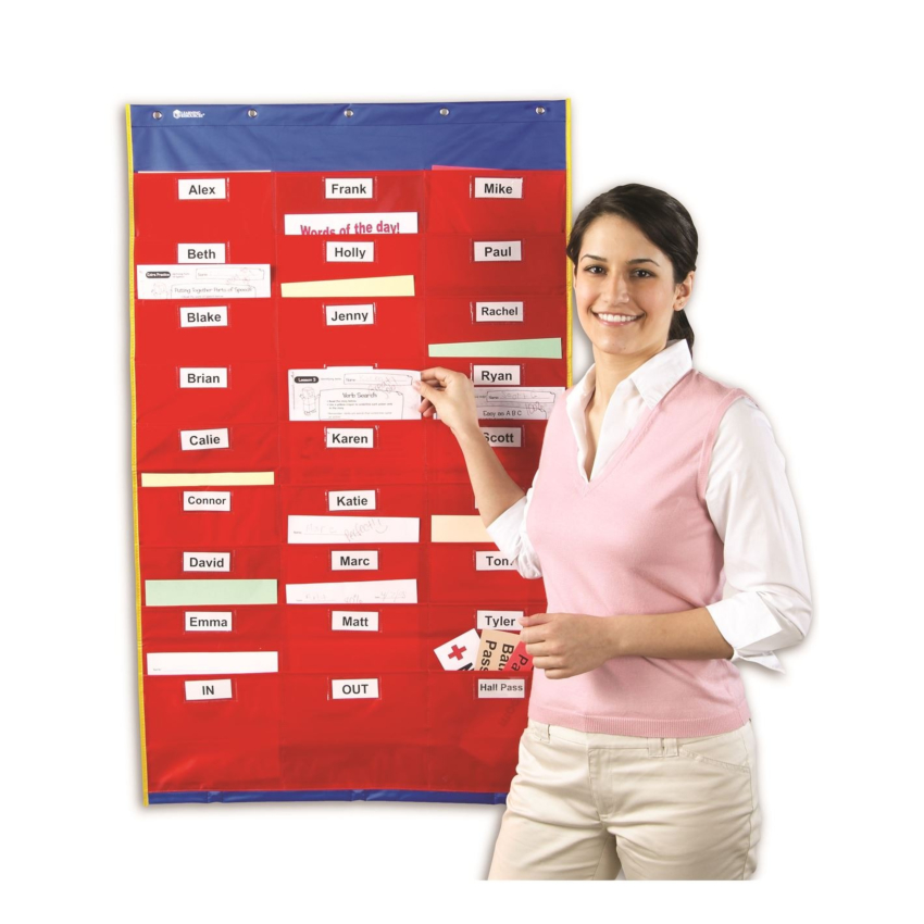 Panel expositor con 27 bolsillos individuales para organizar las tareas de clase por alumno. Incluye etiquetas borrables. Medidas: 72 x 114 cm.