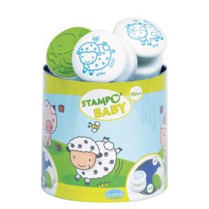 Tampones infantiles de gran tamaño (5 cm Ø) y agarre ergonómico. Incluye 4 sellos distintos y una maxi almohadilla de tinta 100 % lavable. Para niñ@s a patir de 18 meses. Presentación en bote.