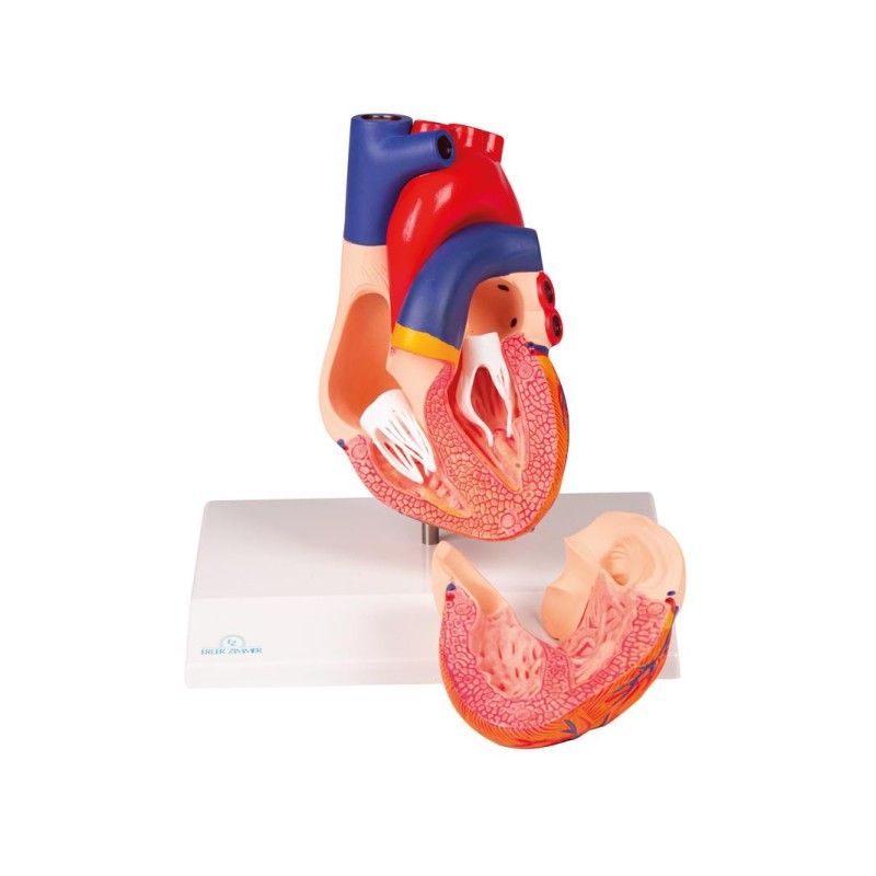 El músculo del corazón, el tejido adiposo, las arterias y las venas están pintados en detalle; las estructuras se muestran en la tarjeta educativa (alemán/inglés). El modelo está hecho de plástico irrompible y extraíble del soporte.